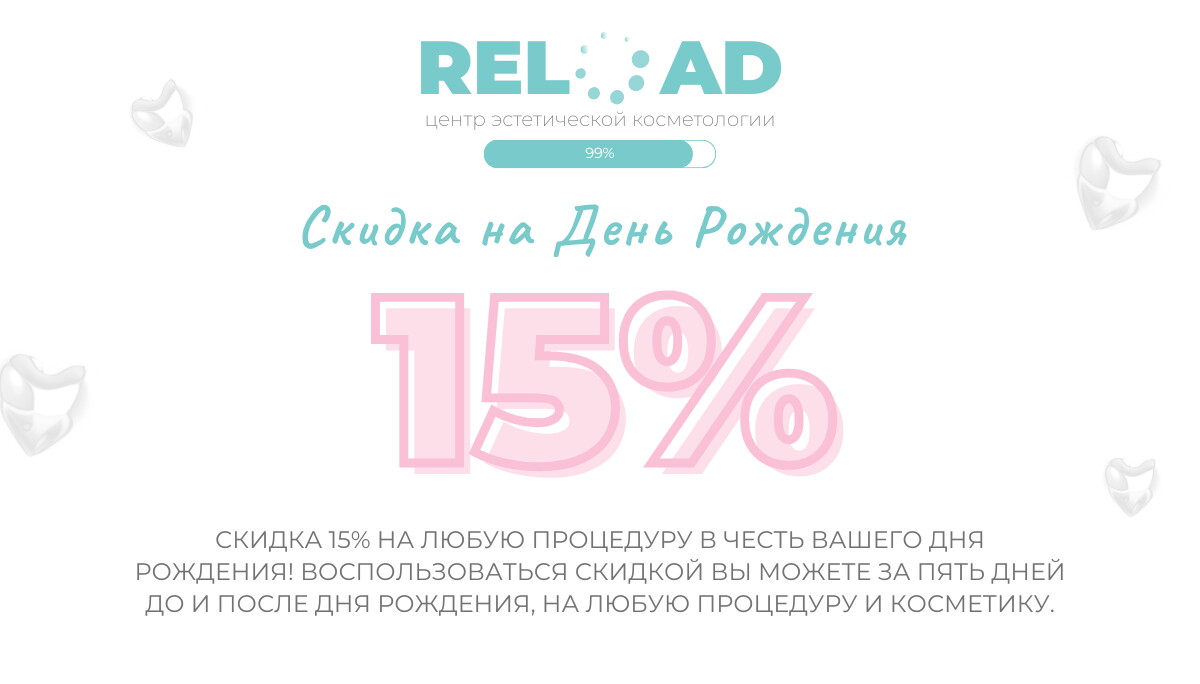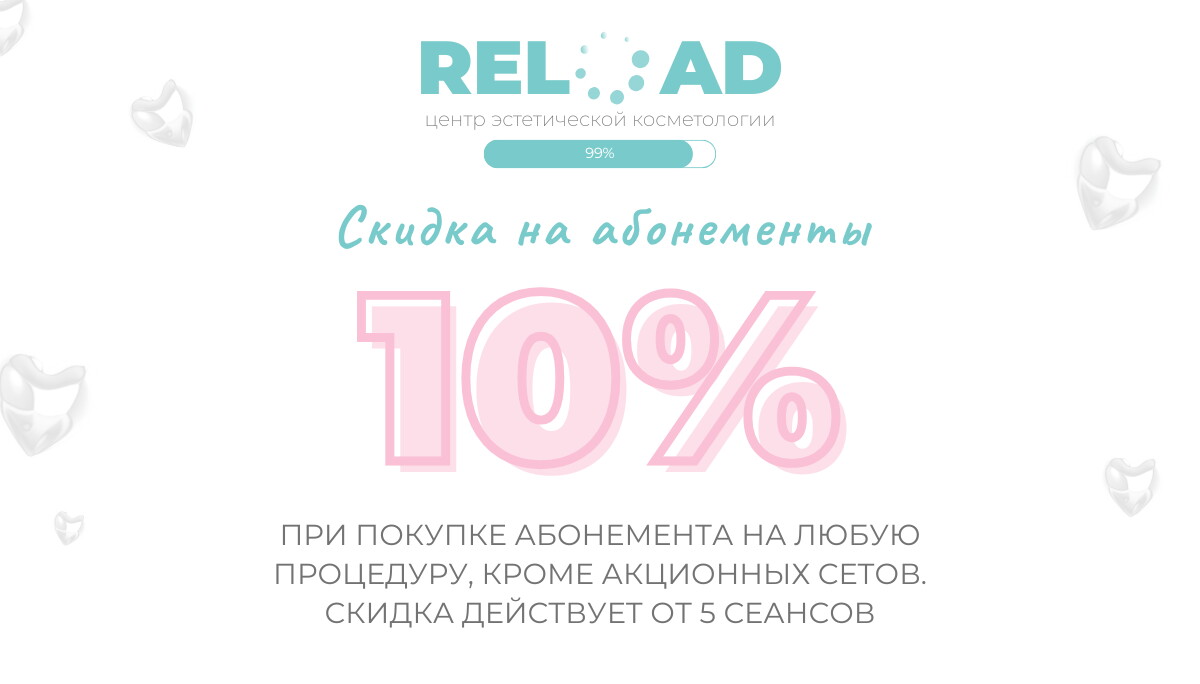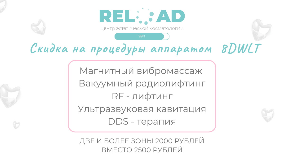 Чем побаловать себя в конце тяжелого рабочего дня или дождавшись выходных после напряженной недели? Выделить пару часов для заботы о своей внешности и самочувствии - универсальный вариант отдохнуть и расслабиться. В этом вам с радостью помогут мастера центра эстетической косметологии Reload. Благодаря их высокому профессиональному уровню и внимательному отношению к каждому посетителю вы уйдете от нас в самых лучших чувствах, и полученный заряд бодрости надолго раскрасит ваши будни.